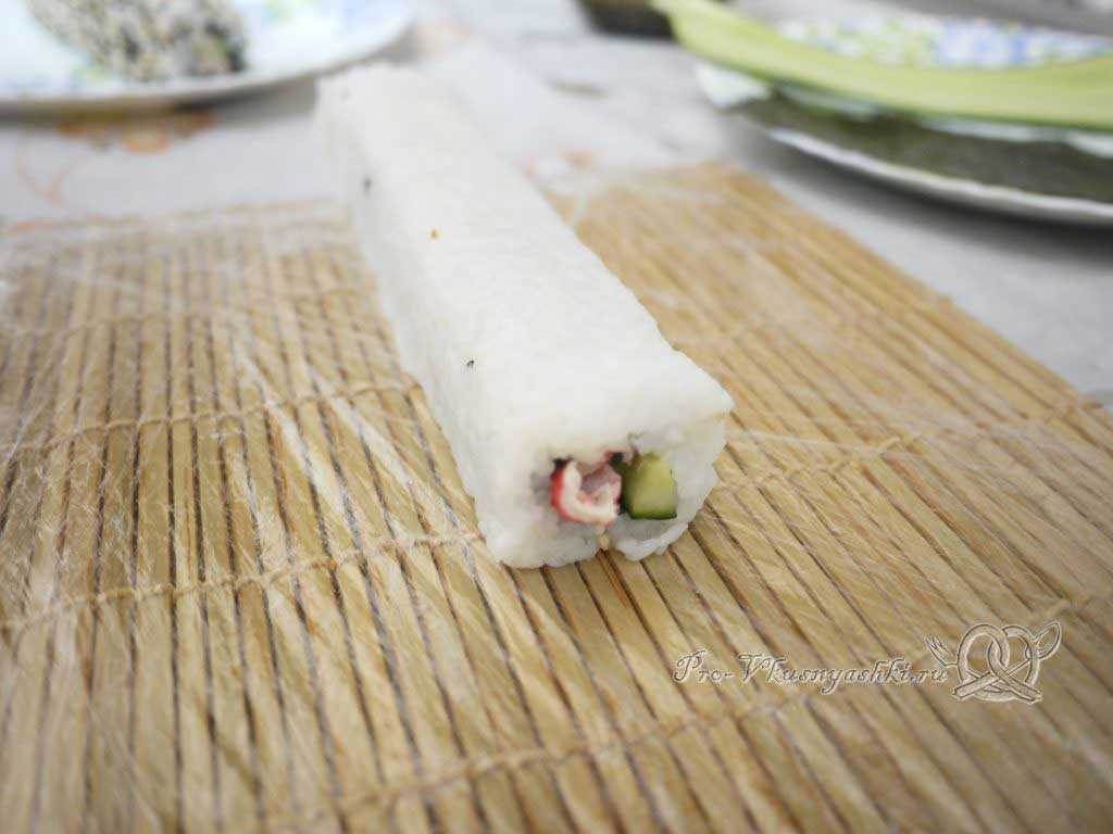Рис с начинкой заворачиваются в нори, а затем при помощи коврика всему блюду придается правильная форма. После этого ролл можно нарезать на порционные части.