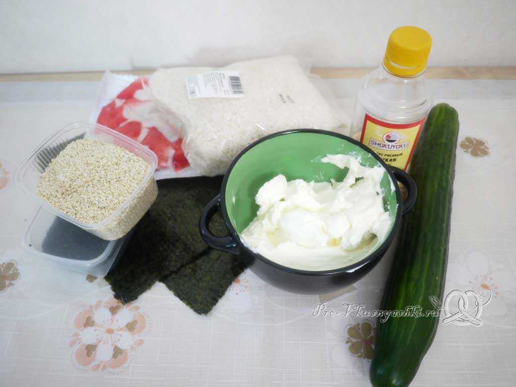 Тебе понадобится: 450 г круглозерного риса, 4 ч.л. воды, 5 ч.л. сахара, 2 ч.л. соли, 1 ст.л. рисового уксуса, нори, огурец, зеленый лук, куриное филе (жареное или копченое), сливочный сыр, кунжут.