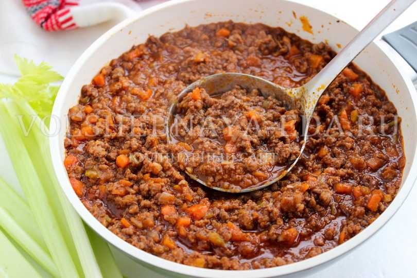 5. Когда мясо почти приготовилось, налейте 4-5 ложек кипятка из кастрюли и прикройте крышкой. Потомите немножко на минимальном огне. Тушится эта фаршевая заправка должна суммарно 15 минут.