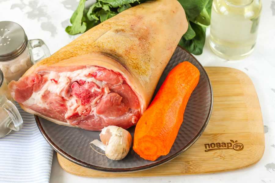 Подготовьте свиную рульку. Замочите ее на 1-2 часа в воде, затем тщательно вымойте под проточной водой, отскоблите шкуру щеткой или кухонной сеточкой.