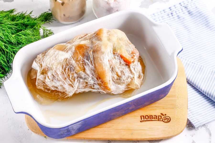9 Обернуть его в несколько слоев пищевой пленки или положить в пакет для запекания. Скрутить концы пленки/пакета, чтобы получилось что-то вроде плотной колбаски. Обязательно зафиксировать кончики, чтобы они не развязались. Можно дополнительно обвязать рулет кулинарной нитью или шпагатом. Можно сразу отправлять рульку в бульон или оставить в холодильнике еще на сутки.