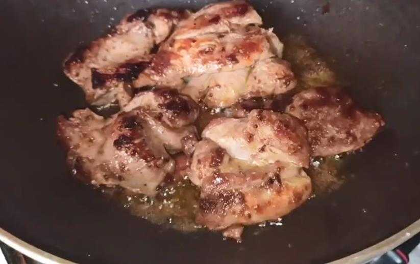 - Курятину вымыть, обсушить сухими салфетками. Обжарить на сковороде в раскаленном растительном масле с обеих сторон до румяной корочки, немного посолить.
