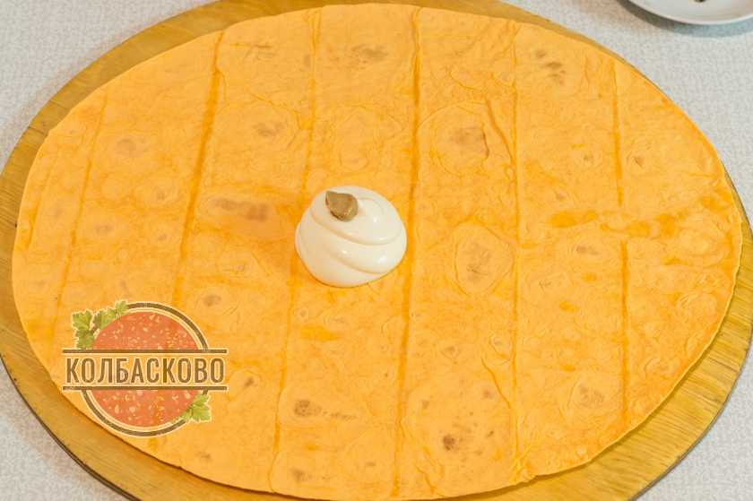 3. Смазываем этой горчично-майонезной смесью всю поверхность лаваша.