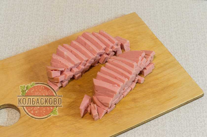 5. Докторскую колбасу освобождаем от оболочки, нарезаем ее брусочками.