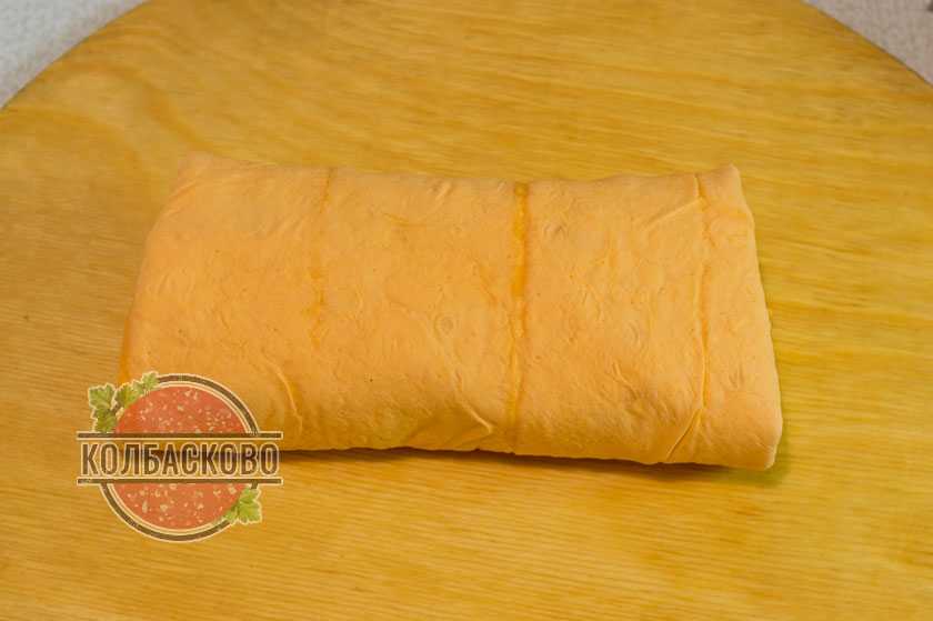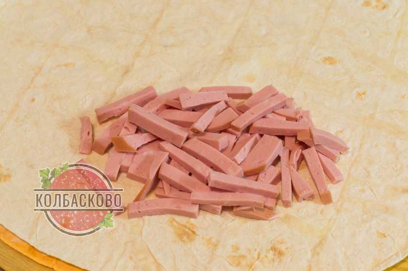 - С самого края лаваша, по средине, выкладываем колбасу.