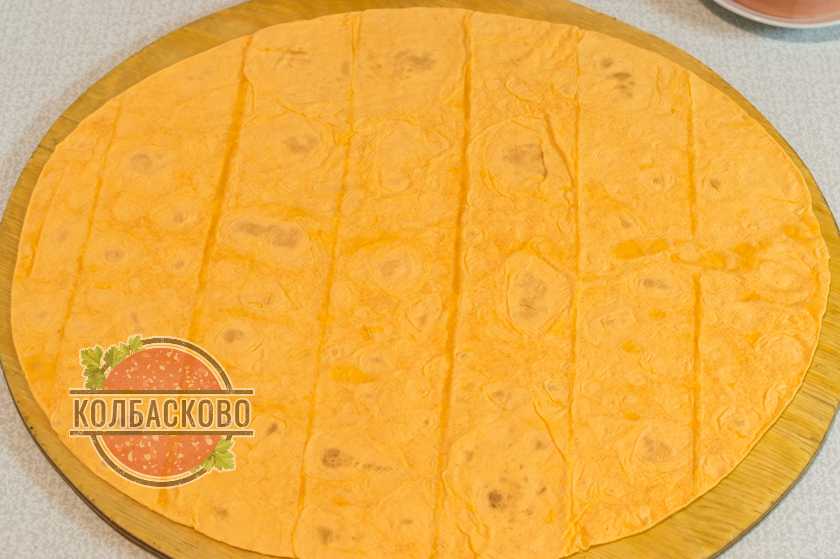 - Отрезаем половину лаваша, разлаживаем на столе.