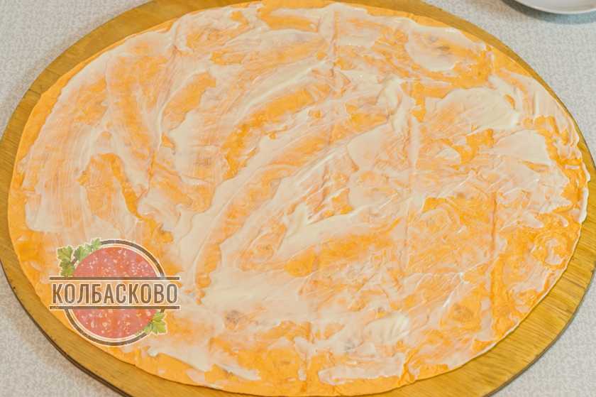 - Смазываем верхушку майонезом и кетчупом, присыпаем натертым сыром. Вырабатываем остатки кетчупа и майонеза.