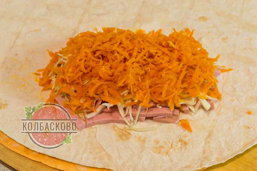 - На колбасу разлаживаем морковь по-корейски.