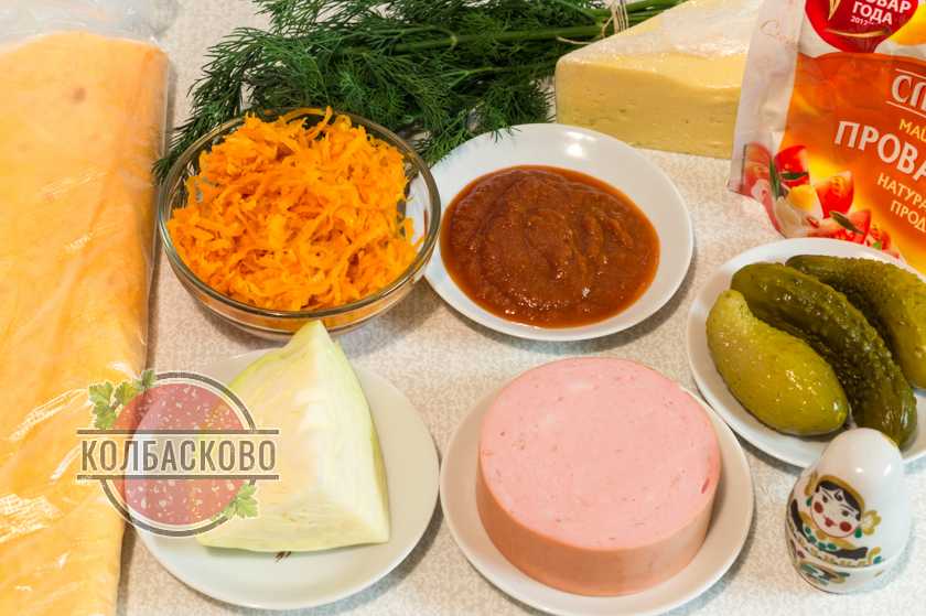 Лаваш — 2 шт.; Колбаса — 150 г; Сыр — 100-150 г; Капуста — 70-100 г; Лук — 1 шт.; Соус «Магги» — Часть;…