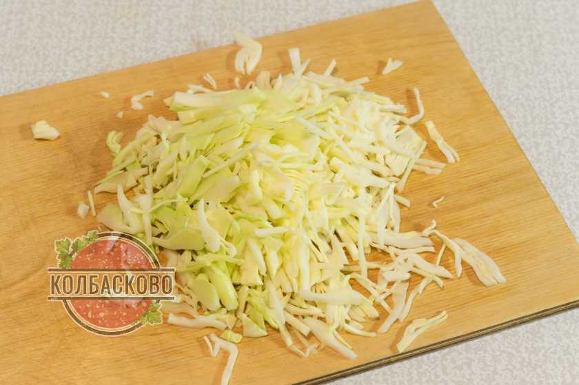 7. Мелко шинкуем ножом (или шинковкой) белокочанную капусту. Ее можно заменить при желании пекинской.