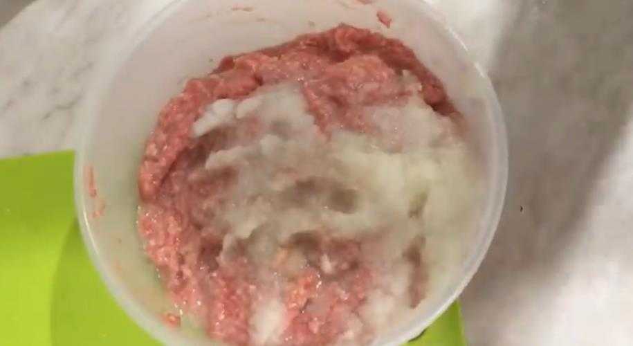 - Хлеб залить водой, дать постоять минут 5, затем отжать и добавить к фаршу. Туда же отправить измельченный в блендере лук и натертое масло. Присолить, приправить перцем или любимыми специями, влить очень холодную воду.