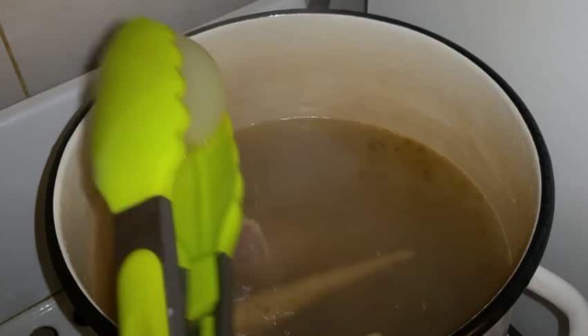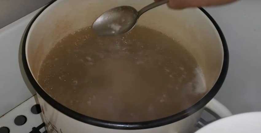 1. Свекольник будем готовить на бульоне из свиного мяса. В бульон добавляем цельные луковицы. Подсолить суп можно как в начале, так и в конце, заправив другими приправами по желанию.