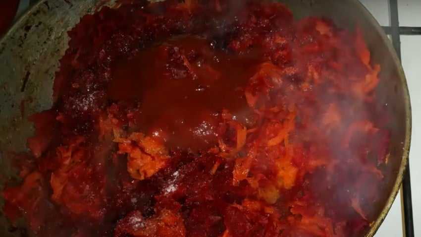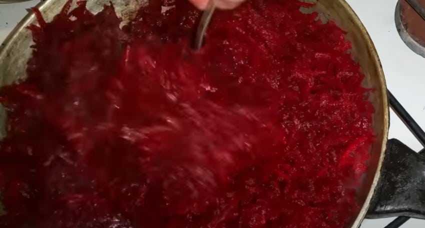 6. Натертую на крупной терке морковь отправляем в сковородку с луком и поджариваем минуты три, после чего засыпаем свеклу и обжариваем еще на протяжении минут 10, периодически перемешивая.