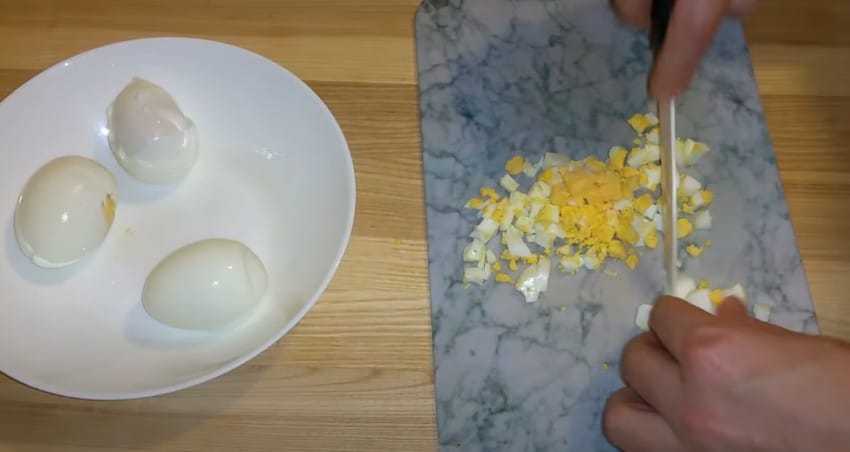 Яйца очищаем и режем на небольшие кусочки. Одно яйцо можно порезать на дольки для украшения.