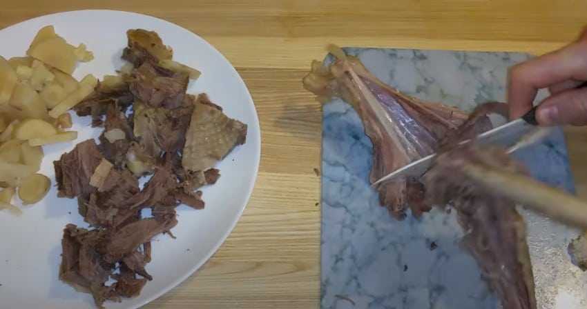 Мясо достаем из кастрюли, режем на небольшие кусочки и снова кладем в кастрюлю. Солим бульон.
