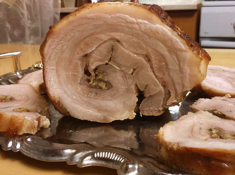 - На уже плотно свернутой свинине необходимо сделать несколько надрезов острым ножом. После – тщательно натереть смесью соли, рубленой зелени и пряностей для мяса.