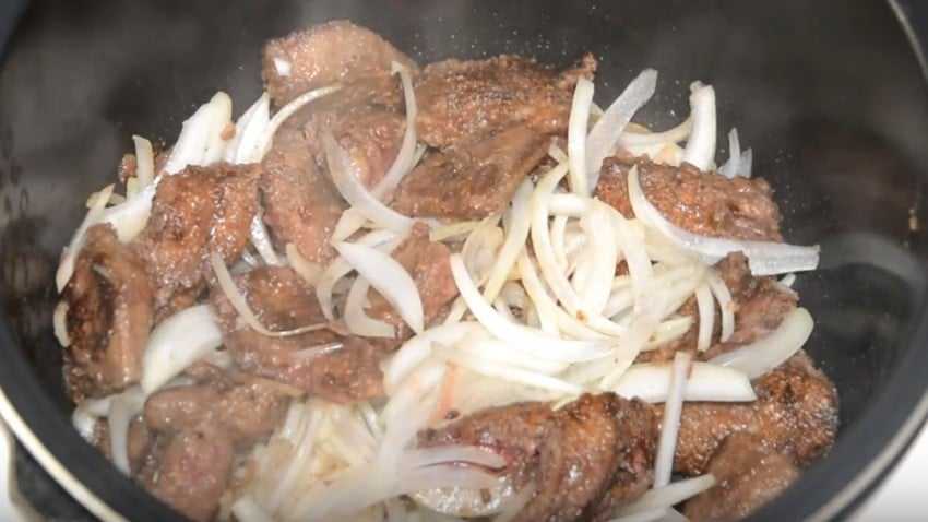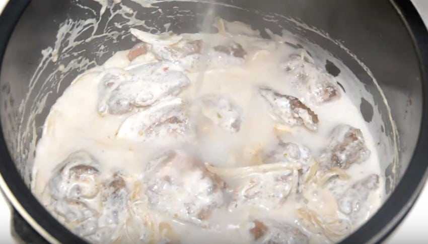 Мягкая свиная печень, тушеная в сметанном соусе в мультиварке
