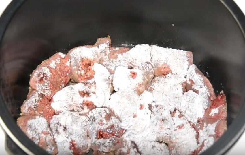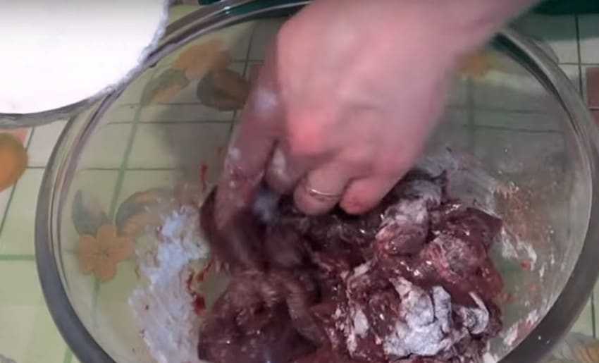 Присыпьте кусочки пшеничной мукой. Тщательно перемешайте все, чтобы кусочки субпродукта как следует запанировались.