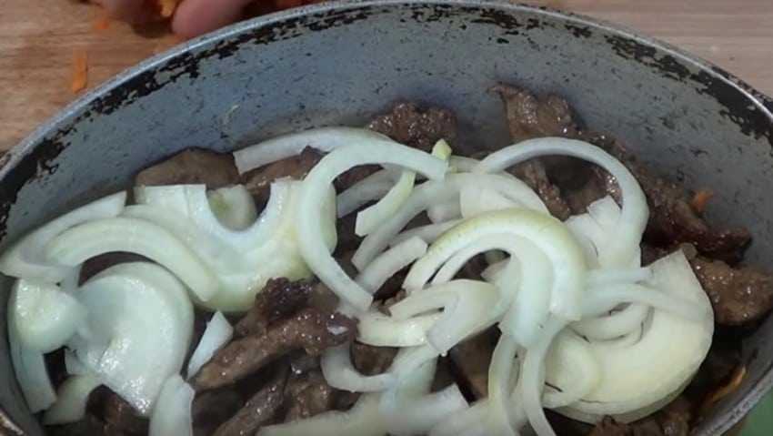 3. К субпродукту добавьте нарезанный полукольцами репчатый лук, перемешайте и продолжайте готовку.