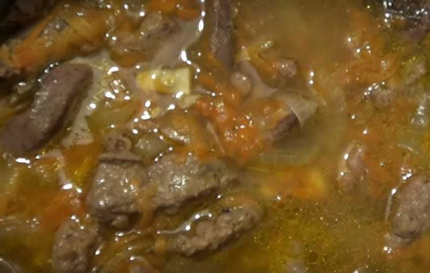 - Добавьте нарезку печенки. Готовьте на среднем огне 10 минут.