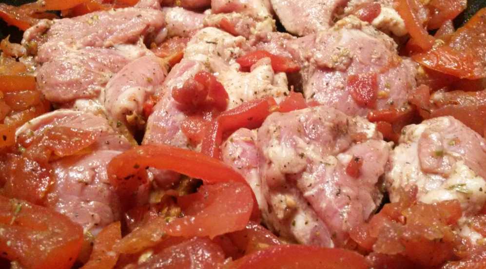 Свиная вырезка жареная с овощами на сковороде