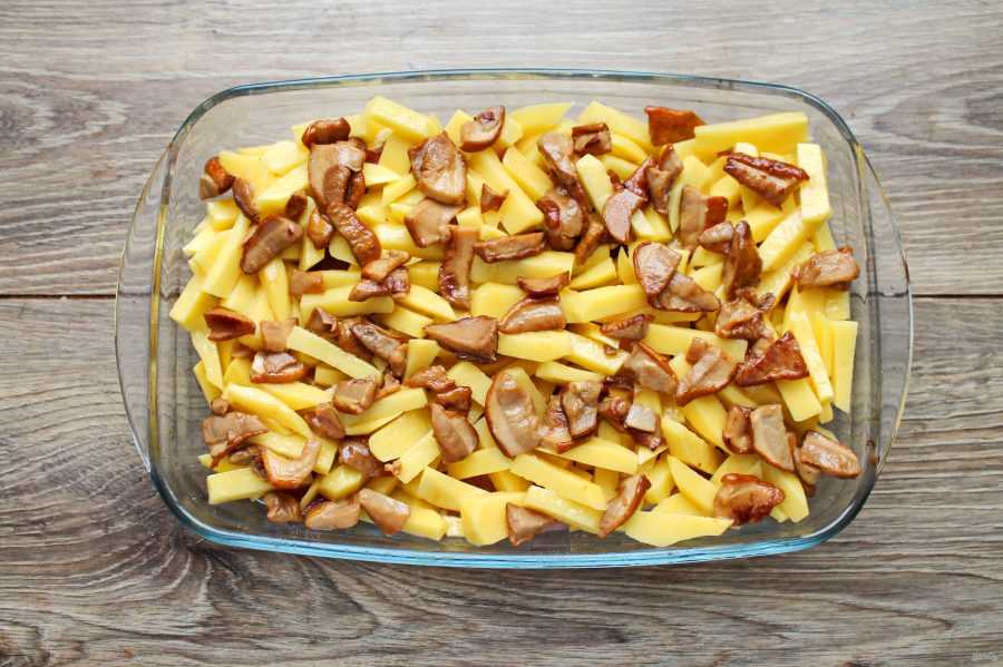 Очистите картофель, нарежьте брусочками. Подсолите, перемешайте и выложите в форму. Сверху распределите грибы.