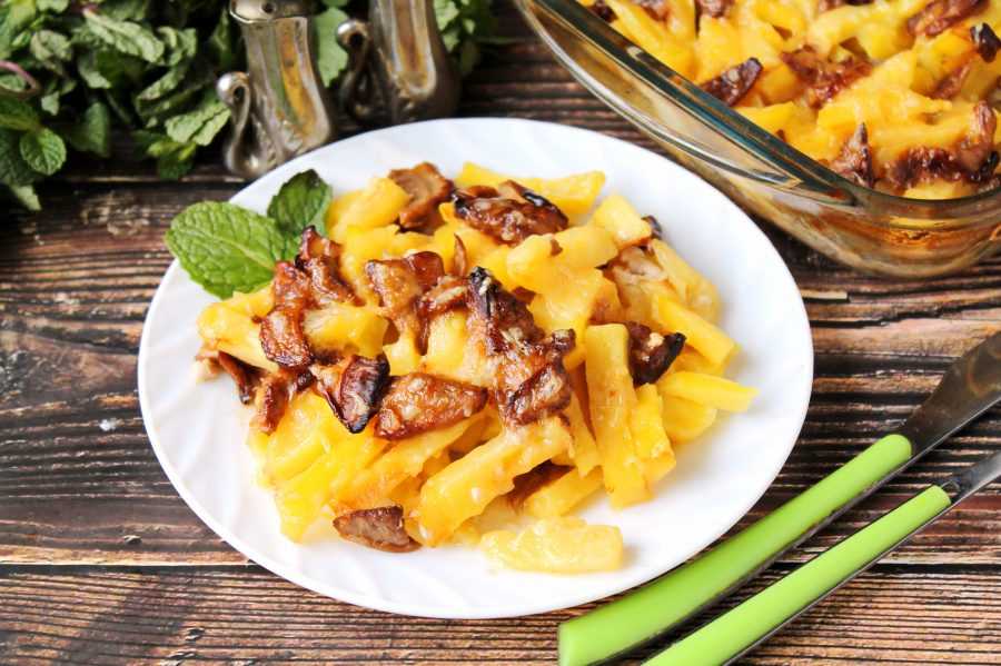 Грибы и сыр – отличные компаньоны для свинины с картошкой. Это блюдо – почти свинина по-французски с картофелем и сыром, однако без добавления майонеза.