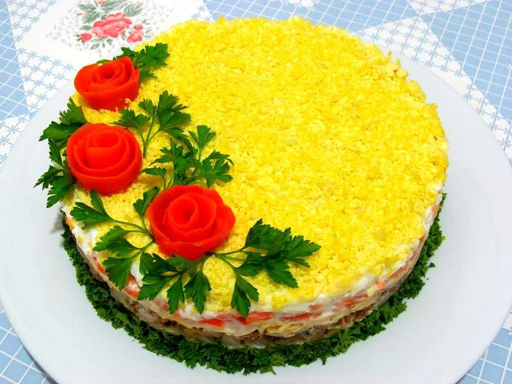 Воздушности закуске добавит сливочное масло в составе продуктов. Не переживайте за фигуру, его там совсем немного. Вкусный, нежный и сытный салат станет красивым дополнением к блюдам на торжественном столе. В будничный день такую закуску можно приготовить на обед.