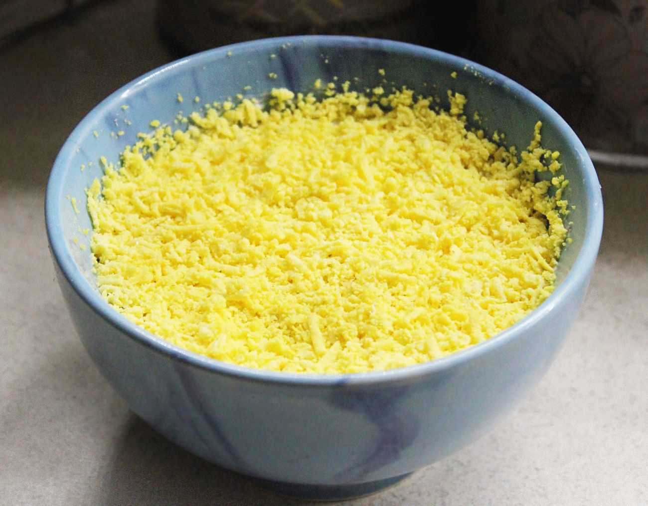 К тому моменту яйца уже сварены. Теперь их охлаждаем, чистим от скорлупки и аккуратно разделяем каждое яйцо на белок и желток. Трем отдельно друг от друга на мелкой терке. Также натираем сыр.