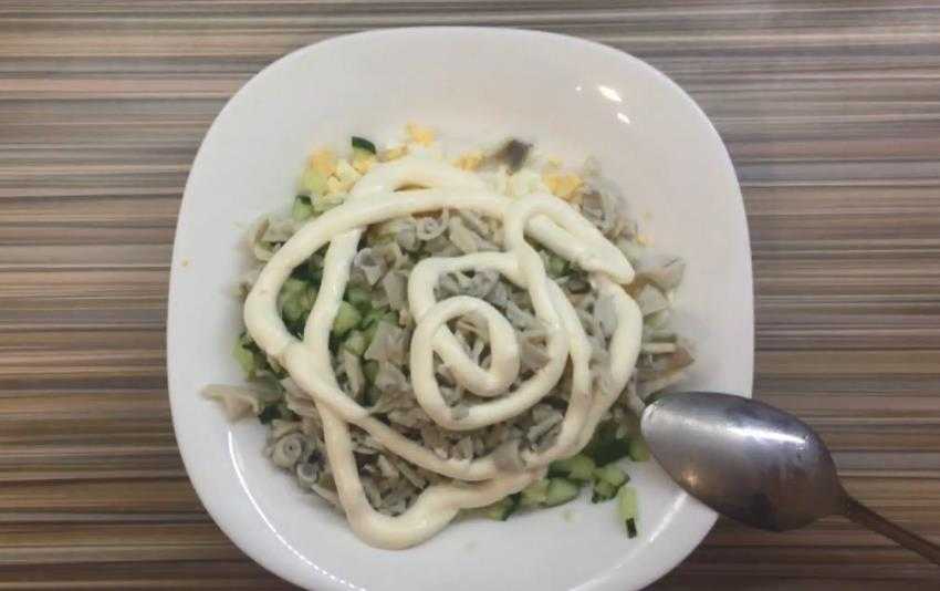 Можно заменить ветчину на язык. Салат со свежим огурцом подразумевает сочетание овощей с легким мясом. Так что говяжий отварной язык отлично подойдет в качестве замены ветчины.