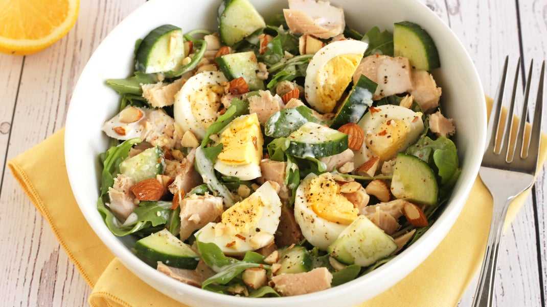 В одной порции такого блюда содержится 45 г белка — это кусочки рыбы, яиц и миндаля. Для заправки используется несладкий греческий йогурт. Освежающую нотку придает огурец и лимонный сок. Рецепт простой и быстрый, хорошо подходит для питательных обедов и ужинов.