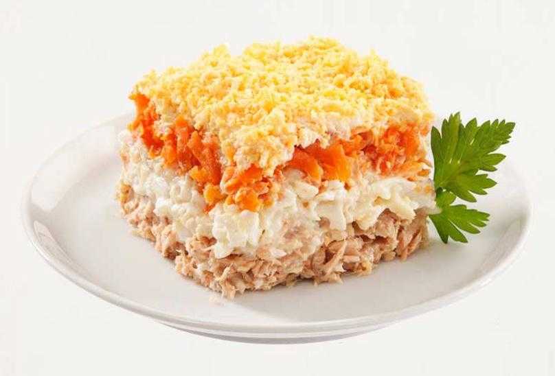 Укладываем в салатницу слоями: тунец – картофель – морковь. Сверху посыпаем натертым белком, а затем – желтком. Готовый салат на полчаса убираем в холодильник, чтобы настоялся.