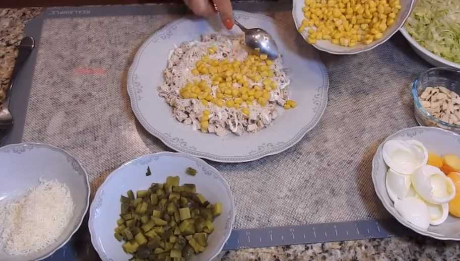Остывшее куриное филе режем мелкими кубиками и укладываем вторым слоем.