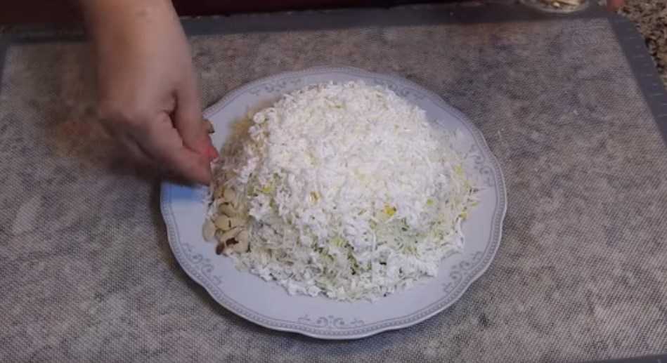 - Посыпаем натертыми сырками, за затем измельченными белками, наносим сеточку.