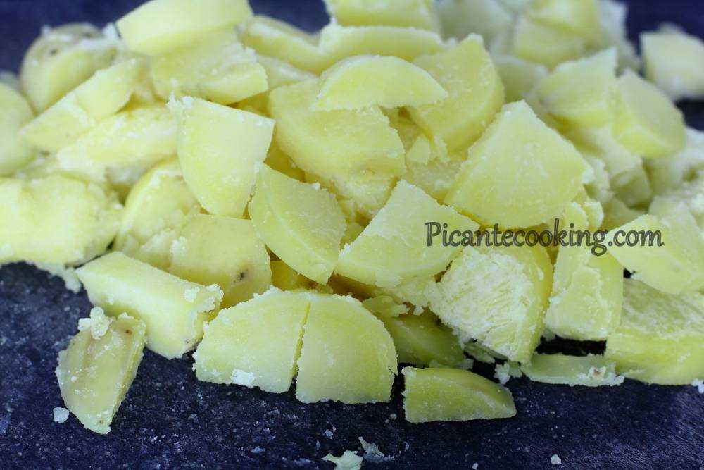 - Пока мы готовили остальные ингредиента, наш картофельный клубень уже успел свариться. Дадим ему еще 5 минут на охлаждение, затем очистим и порубим на кубики по 1 см;