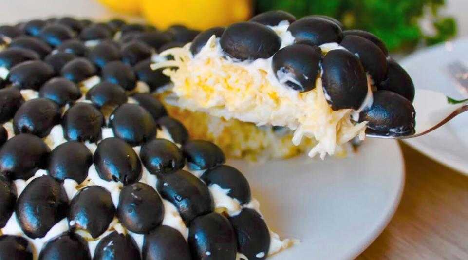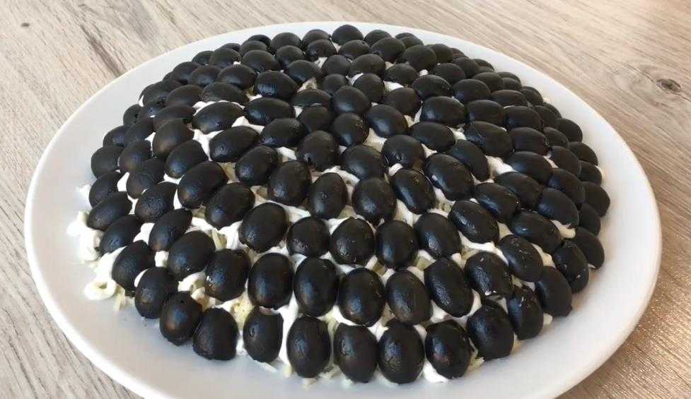 Опять размазать соус, притрусить сыром и густо выложить по поверхности салата маслиновые ломтики.