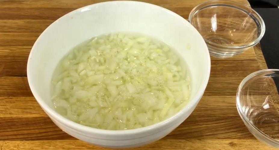 Лук нашинковать небольшими кубиками, полить уксусом. Посыпать специями, залить крутым кипятком и отставить на 25 минут.