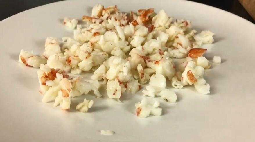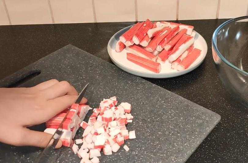 Крабовые палочки нарезать небольшими кубиками, равными кукурузному зерну.