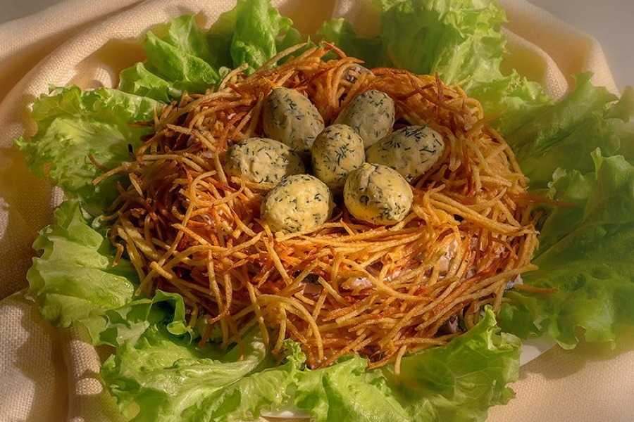 Очень вкусный и простой рецепт салата «Гнездо глухаря» с сыром