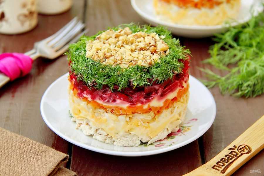 Выкладывайте ингредиенты слоями в прозрачную салатницу или на плоское блюдо при помощи кулинарного кольца. Каждый слой смазывайте тонким слоем майонеза, а лучше рисуйте майонезную сеточку. Для этого выложите майонез в целлофановый пакет и срежьте у него острый уголок. Слои снизу идут так: мясо, сыр, яйца, морковь, свекла. Затем промазываем верх и бока майонезом, бока посыпаем укропом, а сверху выкладываем орехи. Готово! До подачи салат храните в холоде.