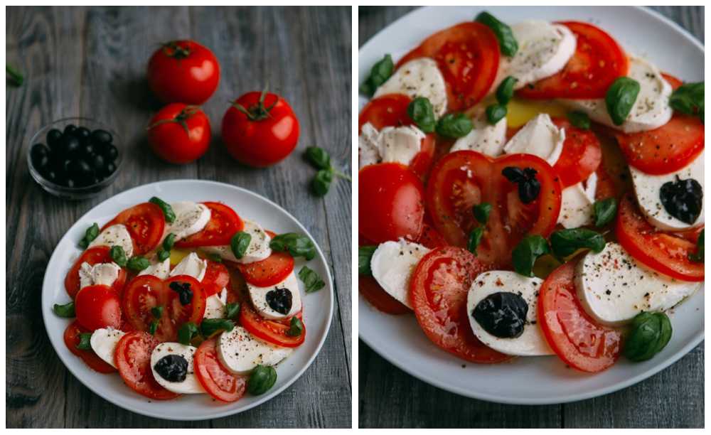 В оригинальном варианте Капрезе в Италии используют помидоры сорта «Бычье сердце». Такие овощи очень крупных размеров, имеют сладковатый привкус и песочную мякоть. Но каждый повар может выбрать другие виды помидоров (водянистые сорта брать не рекомендуется, в них мякоть может выпадать из сердцевины). Сыр Моцарелла стоит брать классический, без добавлений, орехов, зелени или специй, поскольку эти составляющие будут идти отдельно в салате. Рассмотрим самые популярные рецепты блюда для приготовления в домашних условиях.