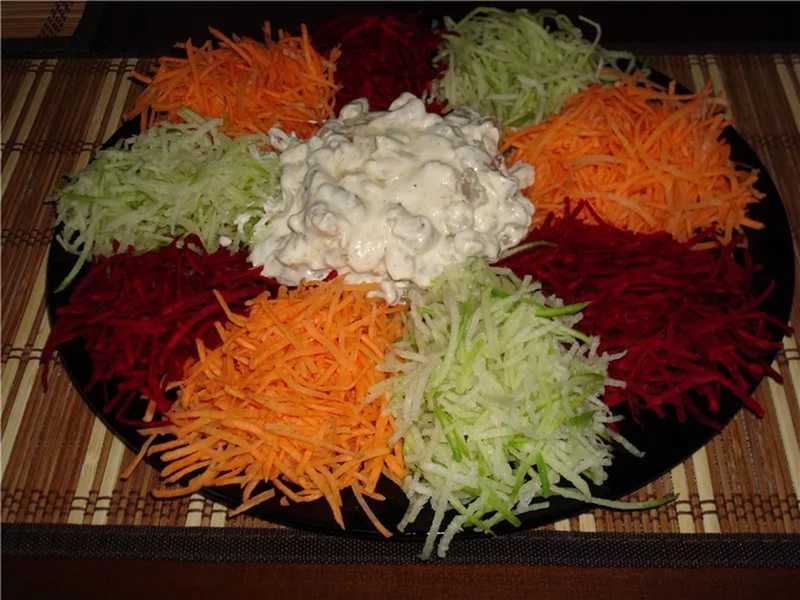 Очень яркое, красочное, ароматное и вкусное блюдо, наполненное массой витаминов. Особенно привлекательно оно выглядит на праздничном столе в холодное время года. Поклонники овощей, приверженцы правильного или диетического питания могут его ввести в ежедневный рацион. Все, что нужно будет сделать, это заменить жирный майонез легким соусом на основе йогурта.