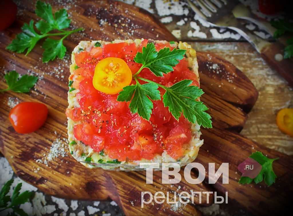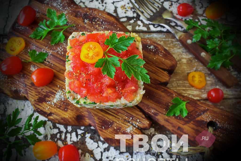 Для порционной подачи использовать сервировочные формы: плотно уложить салат, покрыть оставшимся томатным конкассе, украсить веточкой свежей петрушки. До подачи держать в холодильнике.