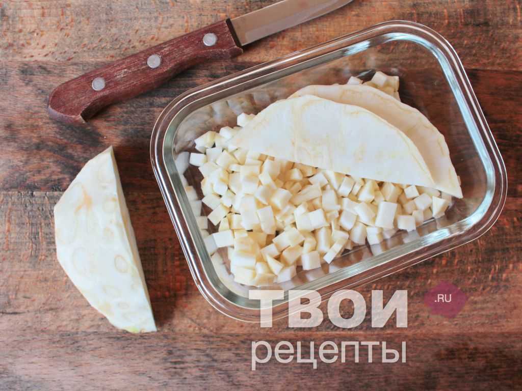Корень сельдерея помыть, очистить, разделать мелким кубиком.
