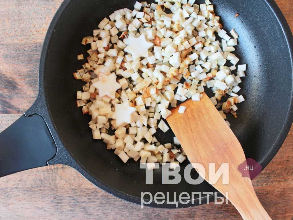 Кубики корневого сельдерея обжарить в небольшом количестве растительного масла до мягкости — остудить.