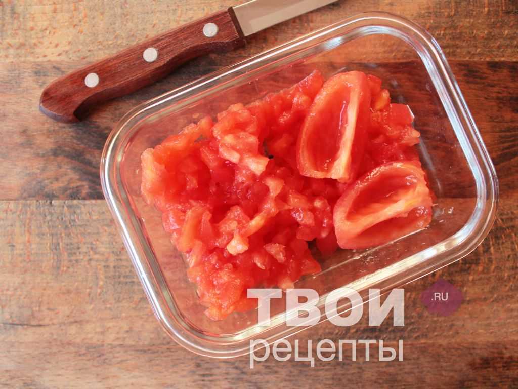 Из помидоров приготовить конкассе: сделать на макушке томатов крестообразный надрез, ошпарить кипятком, кожицу снять; из томатов горчичной ложкой извлечь семена — удалить, томатное филе порубить кубиком.