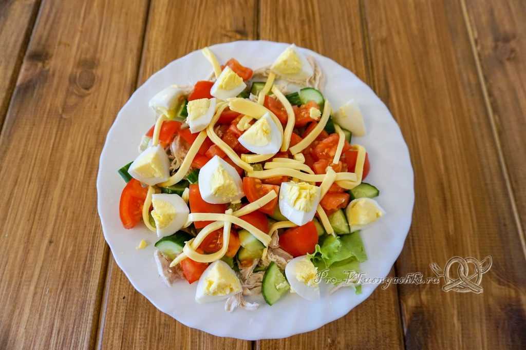 На помидоры и огурцы кладем сыр и яйца в хаотичном порядке.