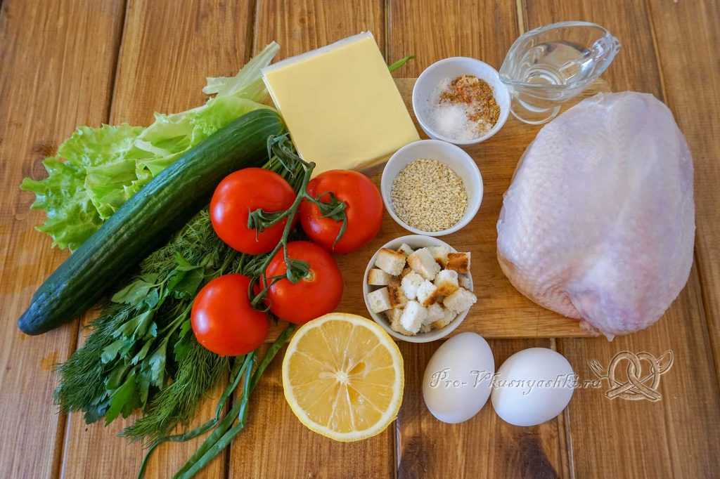 Калорийность продуктов: Копченая курица, Помидоры, Огурцы, Мягкий сыр, Батон, Майонез, Соль, Растительное масло