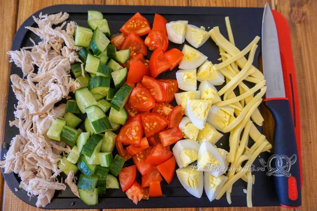 Овощи и яйца нарезаем треугольниками или средним кубиком, сыр — соломкой или измельчаем на крупной терке, отварное мясо разбираем на волокна.