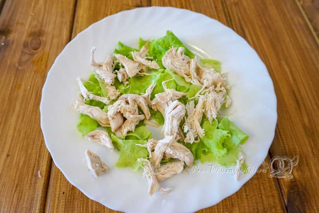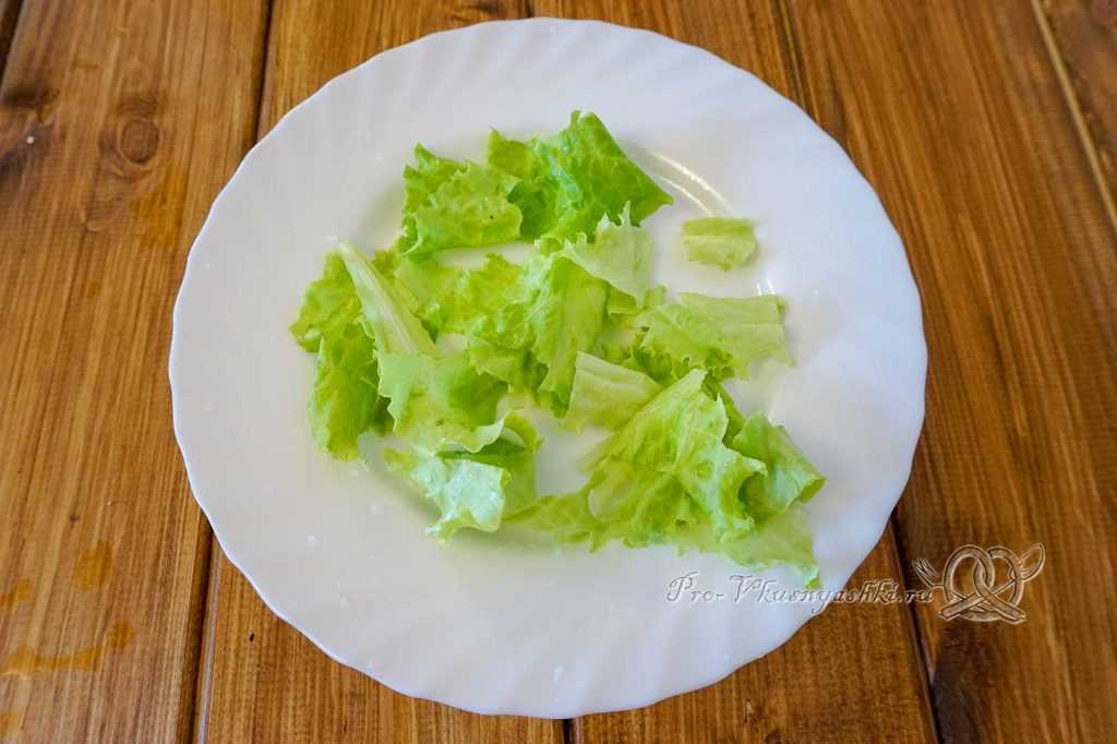 Салат рвем на небольшие части и выкладываем на тарелку.